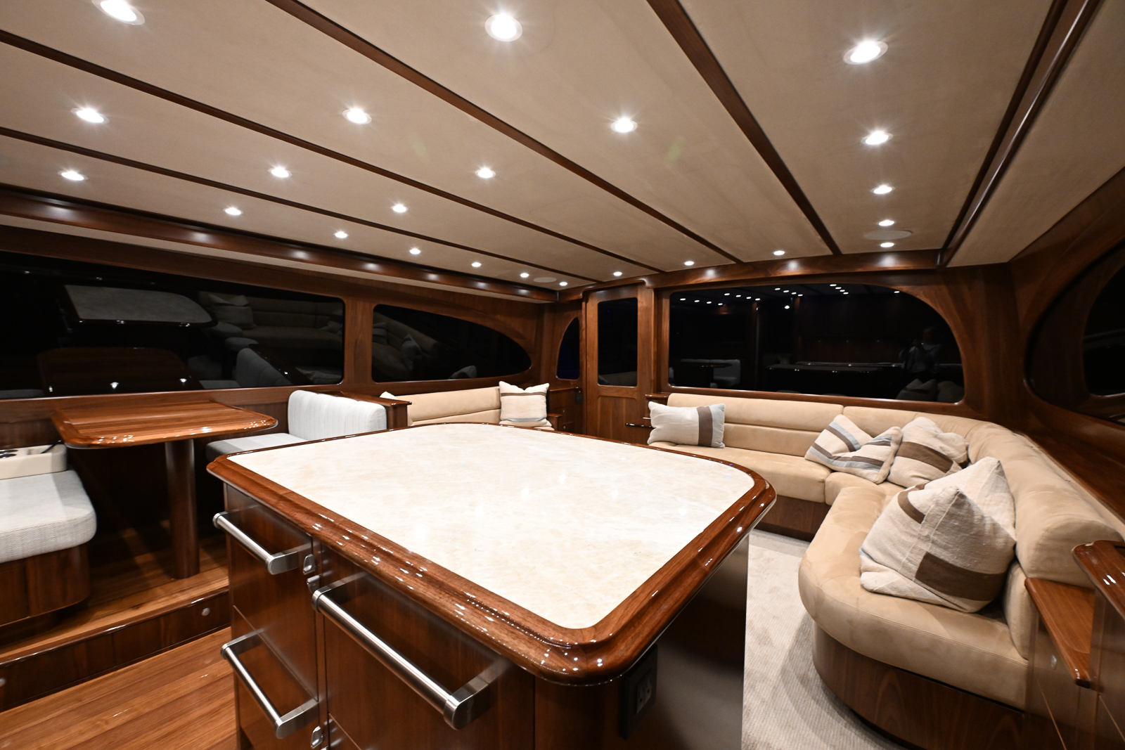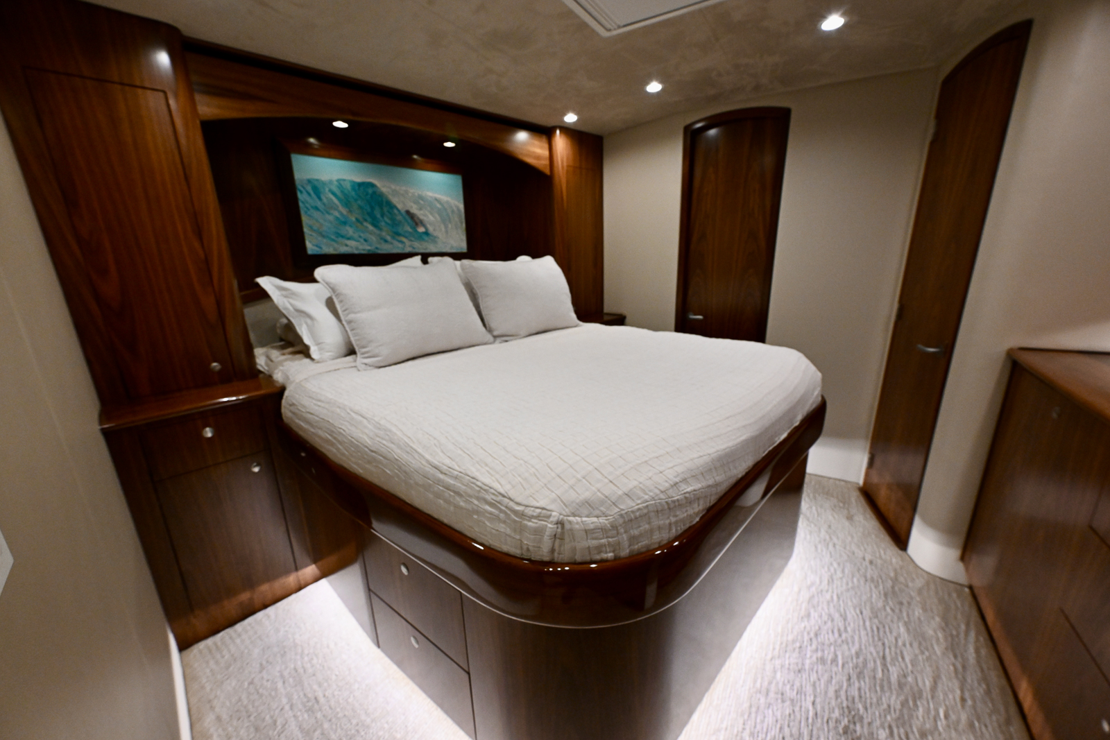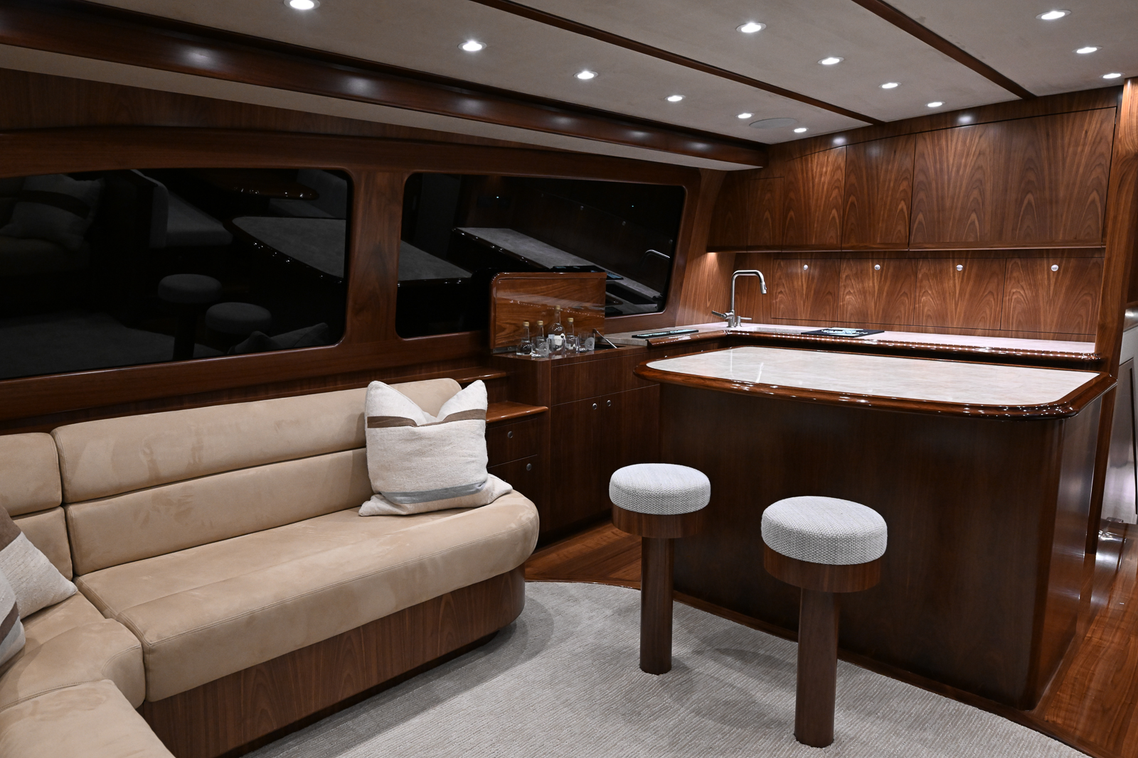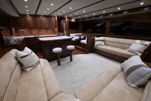 | BRIDGE ARRANGEMENT | Large console port to center with electronics and glove box, forward seating port and starboard with sunbed |